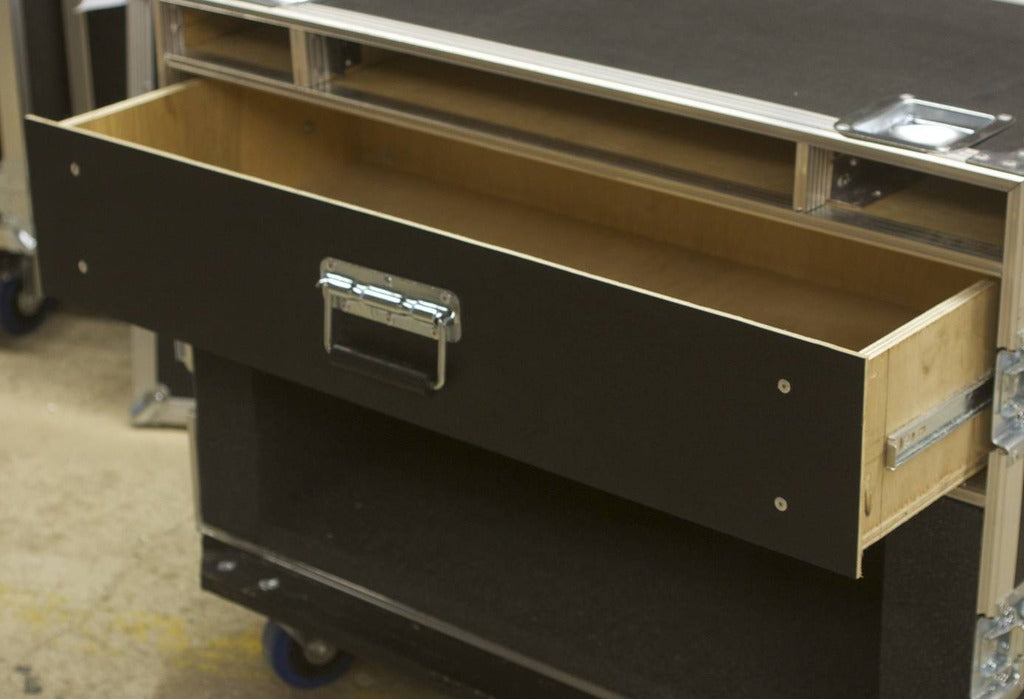 This adds a drawer to your case. Our drawers are built standard out of 1/2 inch Birch, have abs laminated front and back panels with a handle on the front. Obviously, this is not an applicable upgrade to every case we build and depending on the size or type of case, it may need to be increased in price. The drawer comes standard with a 4-6 inchheight (usable space), is the full depth of the case and 2" minus the width of the case. If the drawer is going to be over 32" or more in width, we may need to split it up and have 2 drawers. The drawers come on very good quality sliders with ball bearings and can be removed by pressing the tabs on the sides and pulling out