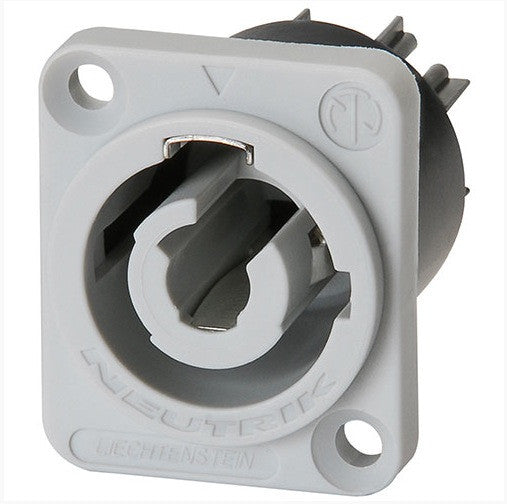 This is a Neutrik brand powercon inlet. These are nice to have on pedal boards and exterior of cases to power because it twists and locks into place, easily recognizable, and very fast to connect. These come in gray or blue. Choose just the inlet if you have your own cable or the inlet with the desired length cables. The cables will have the powercon connection on one end and the other end is a standard 3 prong male plug to connect to a standard 110V outlet (can supply up to 250V/20A)