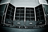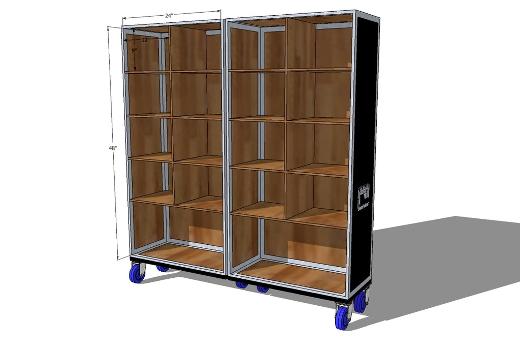 This merch case is designed to carry 4 designs of shirts in 4 different sizes with storage at the bottom for posters, stickers, cds, etc. Each compartment is 12" w x 9" h x 12" d and the bottom compartments are 24 inch w. The shelving can be configured differently - contact us for a quote. These are built custom to order so they can be designed for your needs. We can add in lighting, make the interior a specific color, add locking cash box access, drawers, etc.