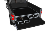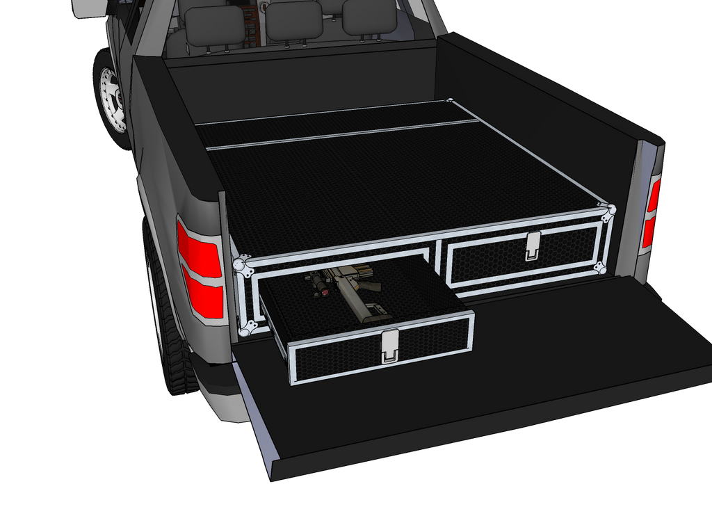 Pictured is a truck weapon storage built for a Raptor with 60" full extension ball bearing slides, hexagrip face, rhino-lined top and custom velcro on the interior for dividers, clips, and keeping weapons in place. This is equipped with a security system that can be accessed by typing in a code on the front or swiping a security card near it (it has a built in proximity sensor) that unlocks the drawers