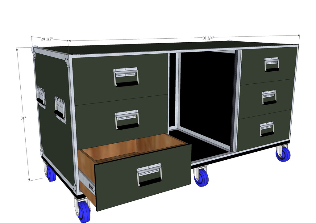 - 12-13U rack space in center (can be shock-mounted for $150 extra)