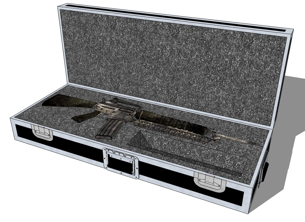 This is a case for an M16 rifle. You can send us a trace of the gun and we can cut it out, we can build it with sheets of foam for the customer to cutout, or build it with a perimeter of foam around the sides. This comes standard in 3/8 inch black ABS with recessed latches, handles, etc. Contact us if you have further questions Be sure to add on the upgrades below!