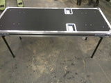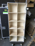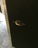 This is a case that was damage in transit. It has some scuffs on the back but just into the wood. We can paint the wood and it'd barely be noticeable. The front lid comes off and is a table with adjustable legs that are worth about $125 for this pair. The lid does have a forklift puncture that we will patch over with a thin steel plate if wanted. The case is 60" h x 24 inch w x 14 inch d on the interior so about 66 inchh x 25" w x 17.5" d with casters and lid on. Photos of the lid with table legs are before the damage but you can see the damages in the first four images.